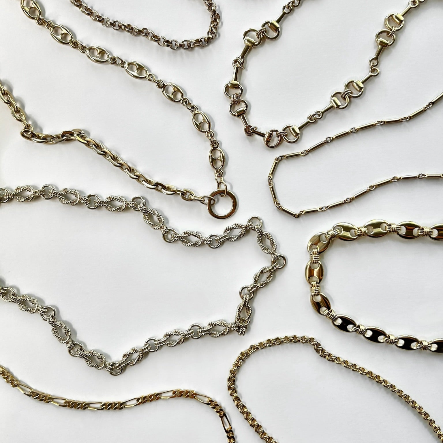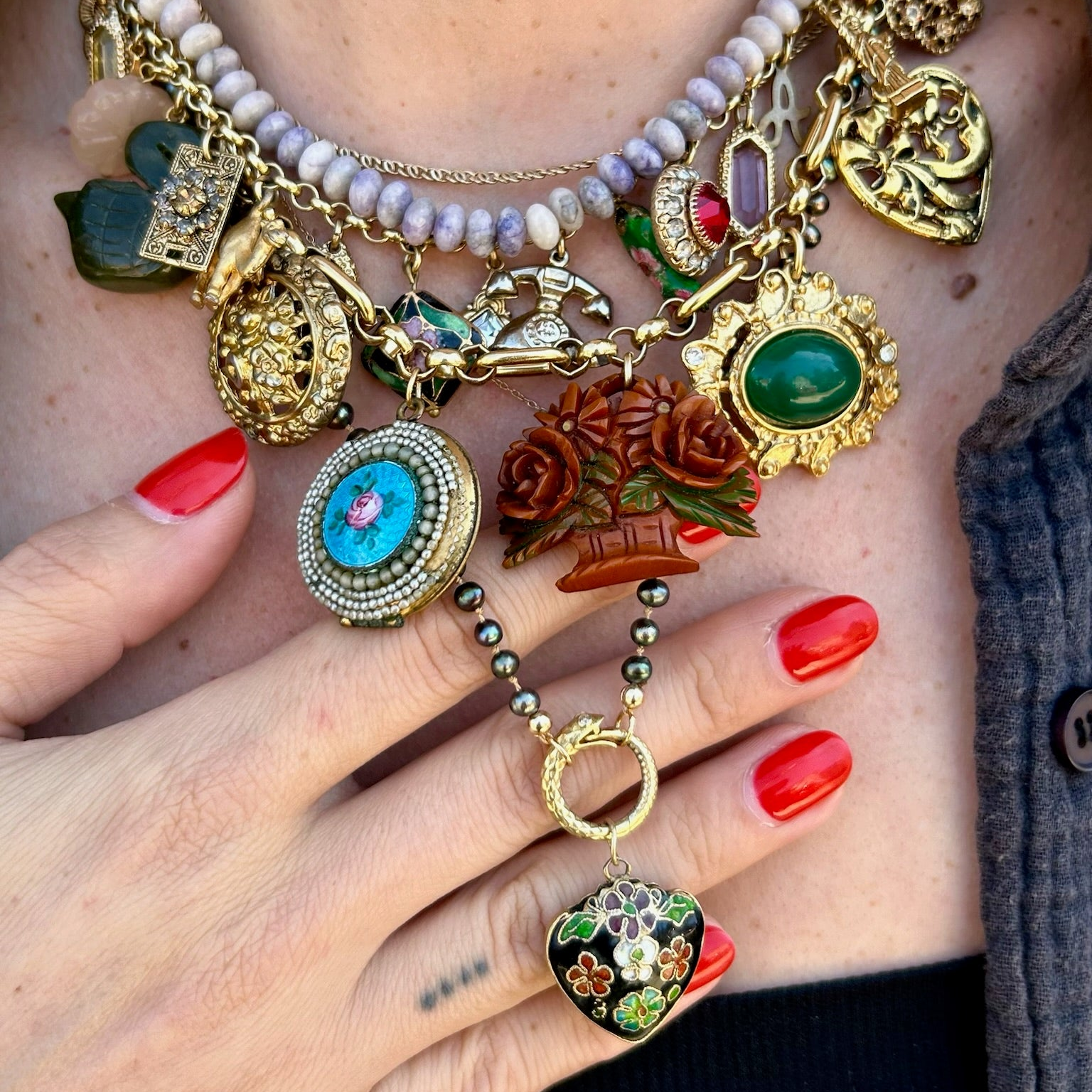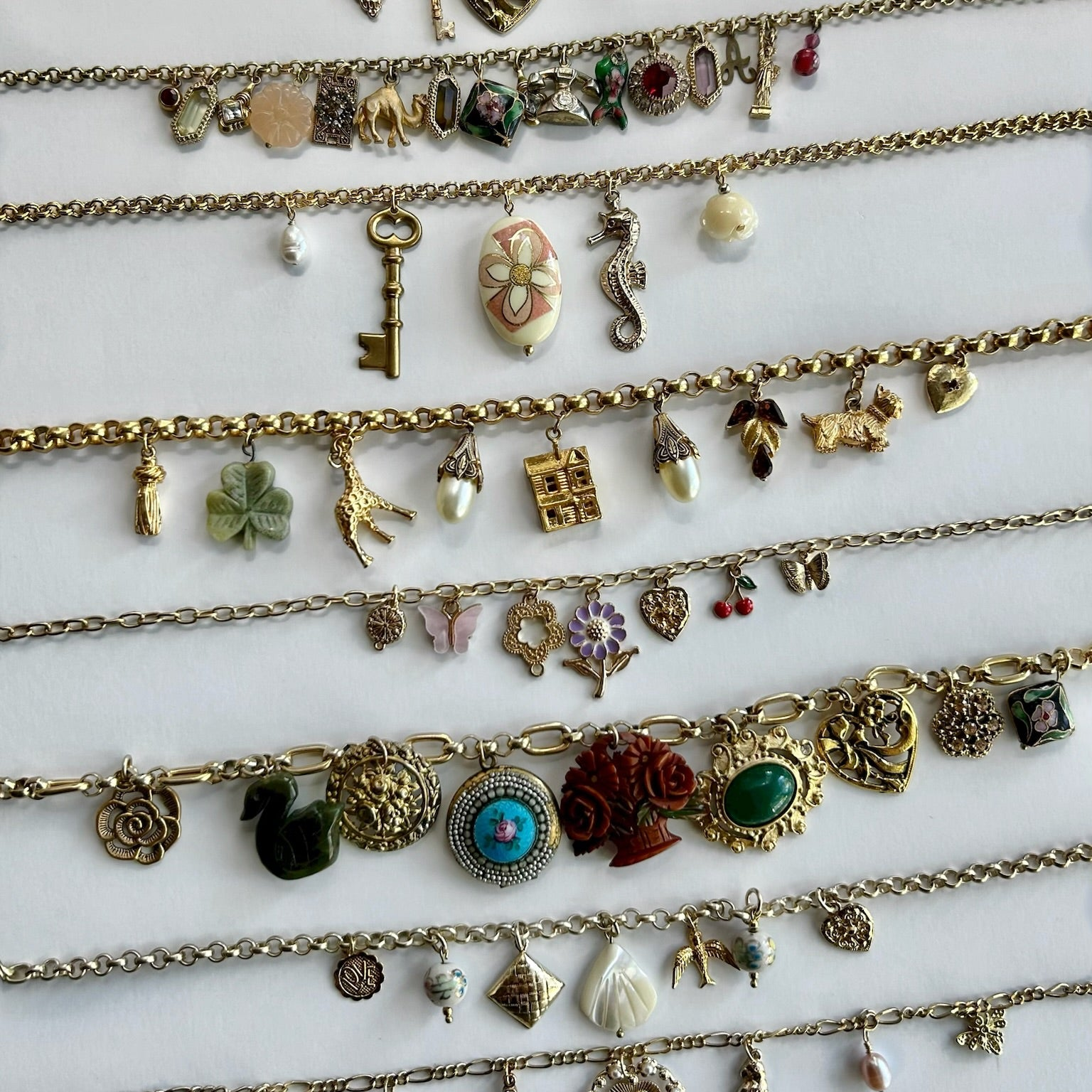 We have a large ever-changing selection of new, vintage, and dead-stock charms. Many of our charms are brass or gold-plated, but we also have a small selection of silver charms if that's your style.