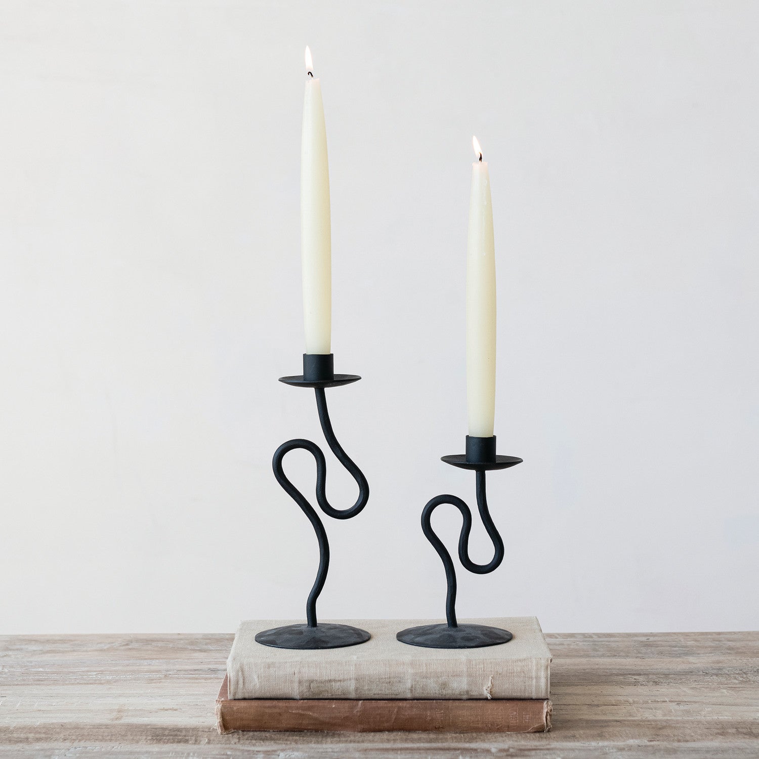 Hand-forged iron taper holder with abstract sculptural design. Finished in matte black. Perfect for displaying tapered candles with artisanal appeal.