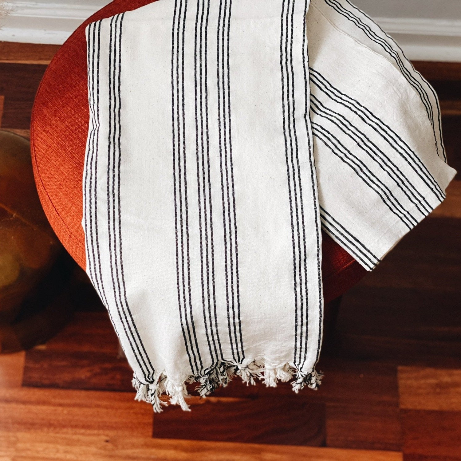 The Ankara Hammam Towel, handwoven from cotton and linen, this timeless classic features a ticking stripe in charcoal black. These towels are wonderfully tactile and extremely versatile; absorbent, quick-drying and lightweight, the perfect travel companion.