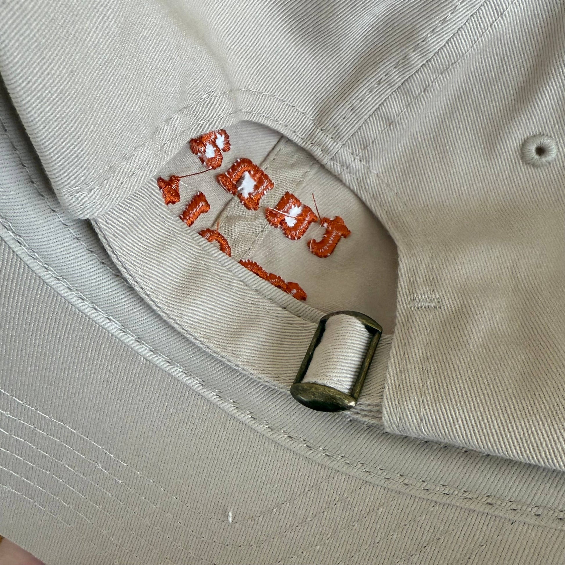 - one size fits most dad hat in a light sand color with orange embroidery