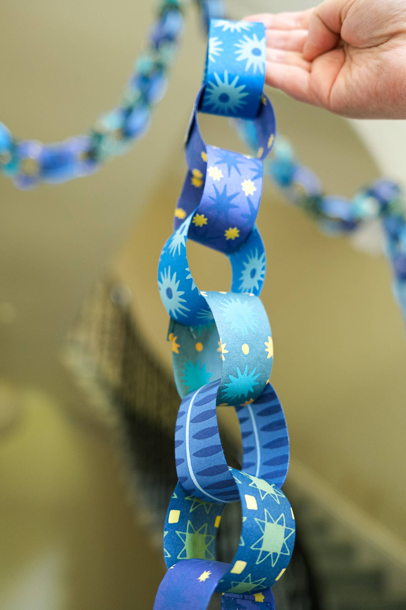 These paper chain kits contain 160 strips of recycled, patterned blue and yellow paper strips which, when assembled, create ~33 feet of beautiful paper chains. Simply use glue or staple each loop to the next to create a classic party decoration. The paper is printed by hand on both sides so your paper chains always look great!