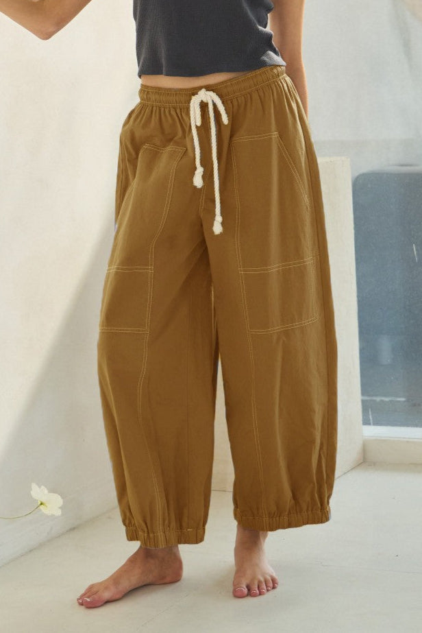 These lightweight, breathable pants are crafted from 100% cotton, featuring unique stitching details and an airy, oversized silhouette. The elastic drawstring waist and gathered ankle cuffs add a casual-chic touch, making them perfect for lounging, traveling, or everyday wear!
