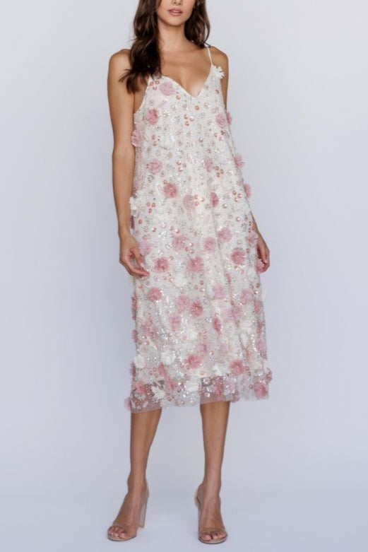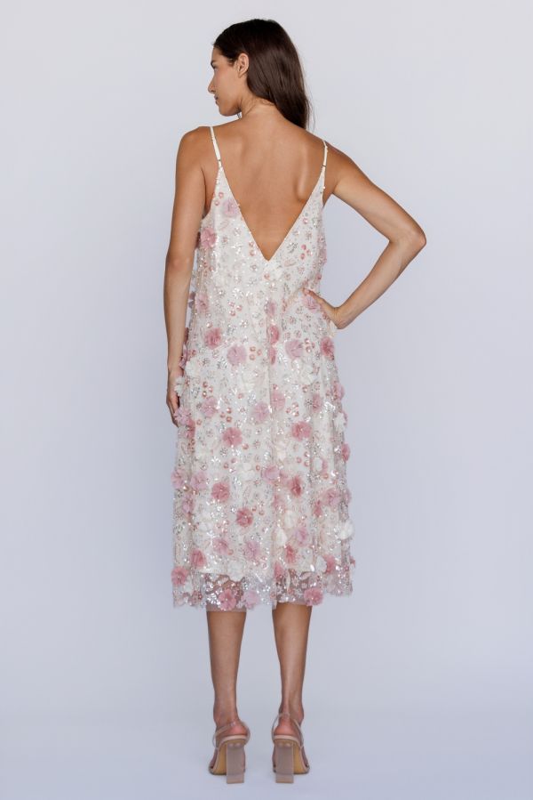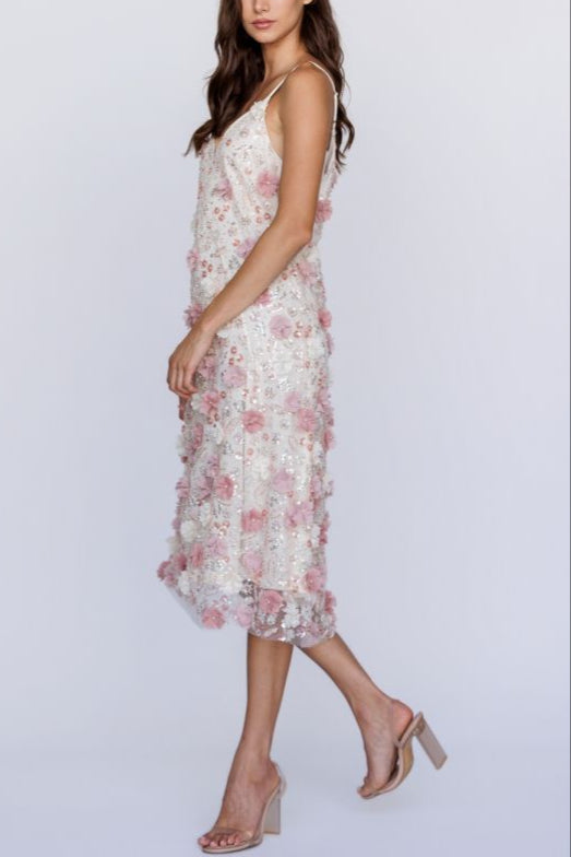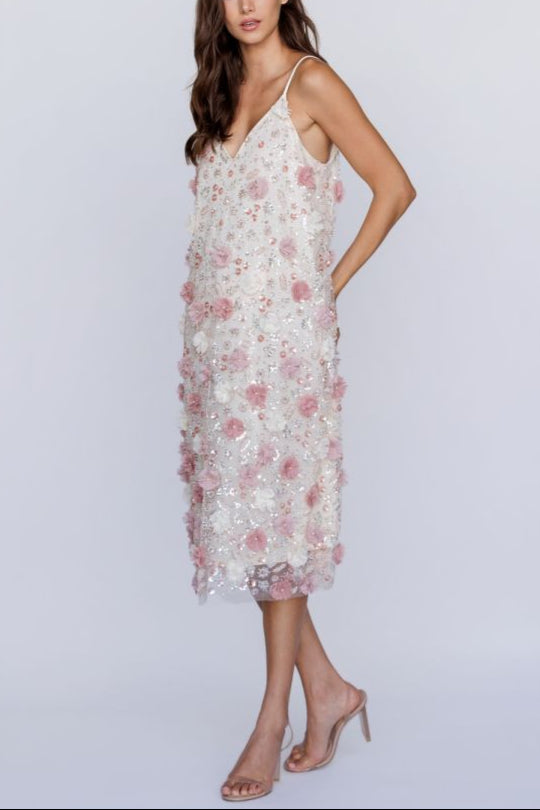 - Embellished with dimensional 3D floral appliques and shimmering sequins throughout