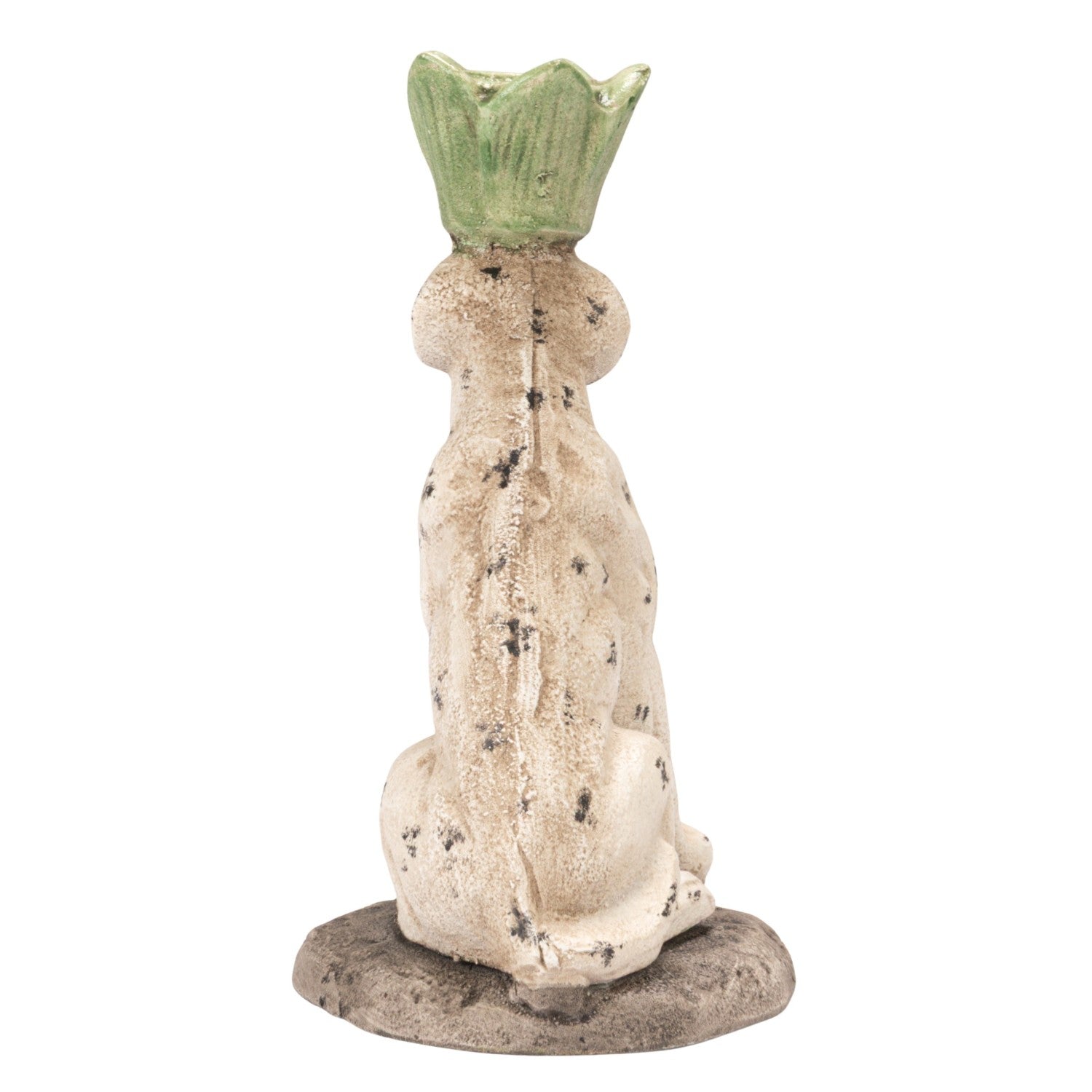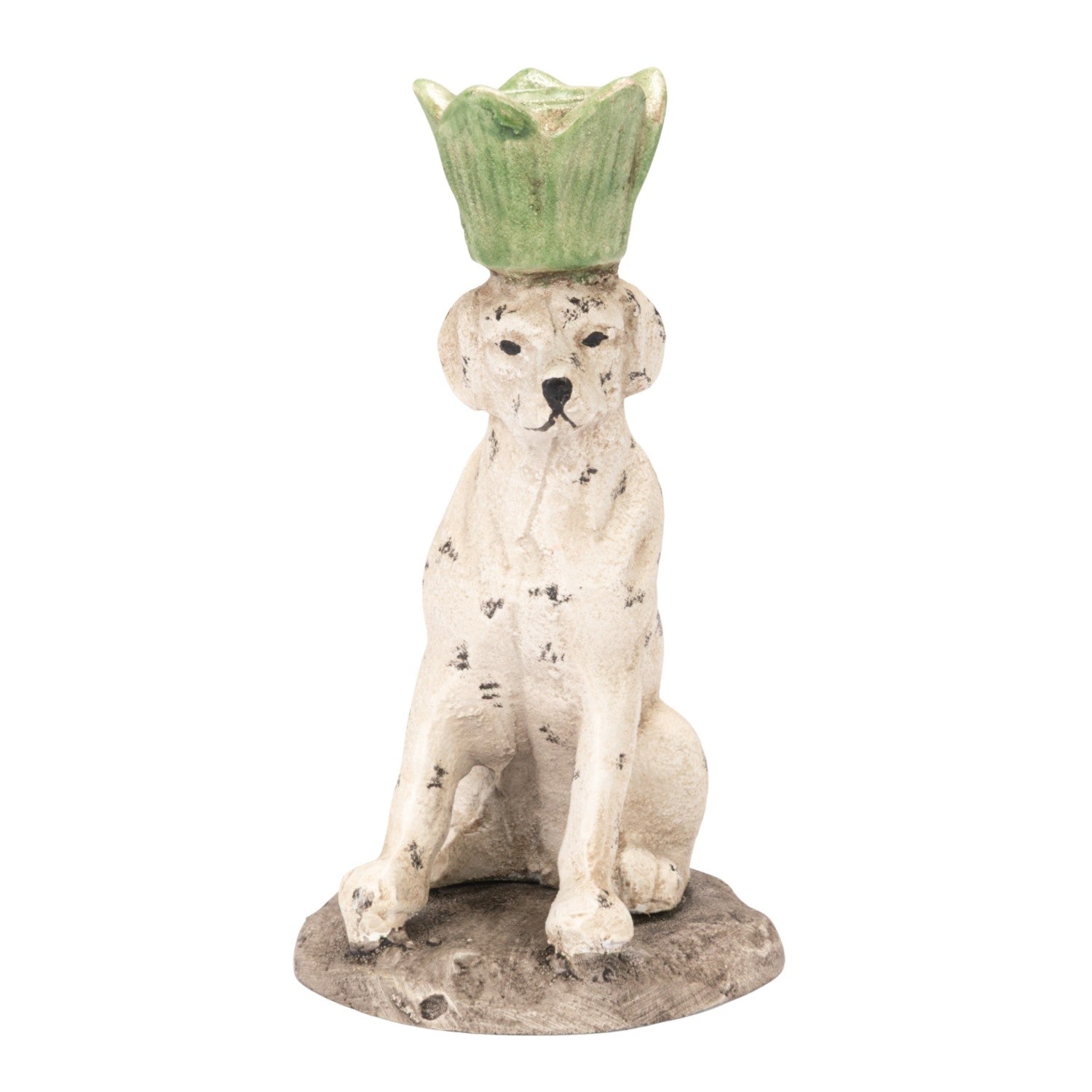 Charming cast iron dog taper holder with a distressed painted finish. Perfect for displaying tapered candles while adding rustic character to any room.