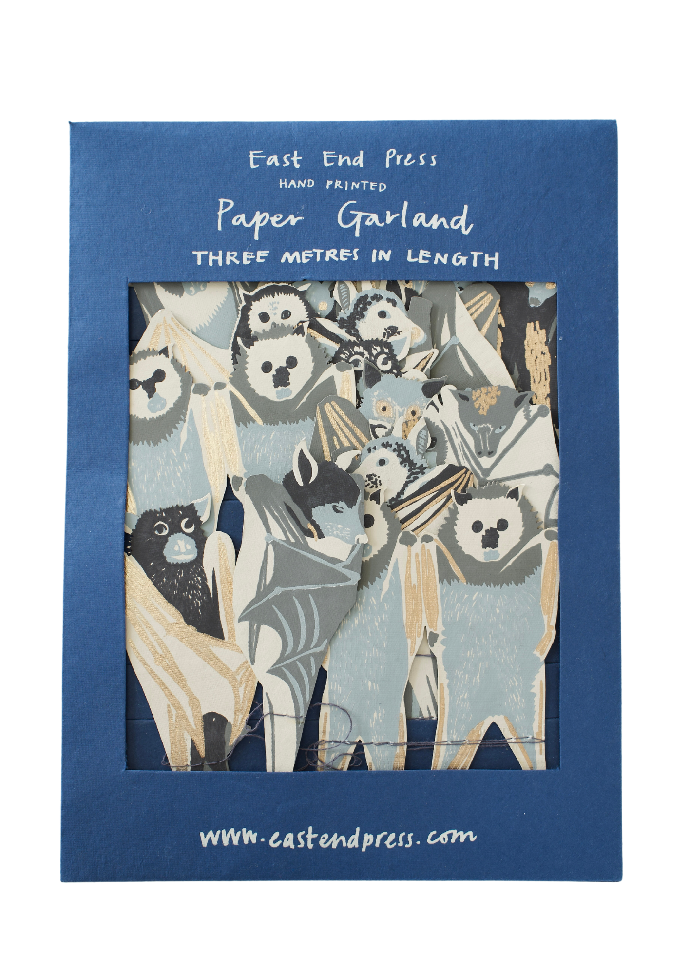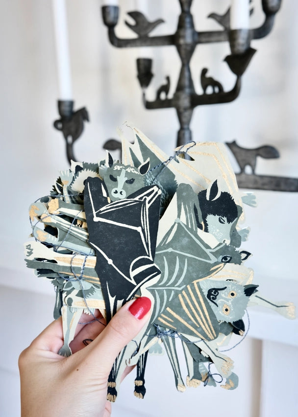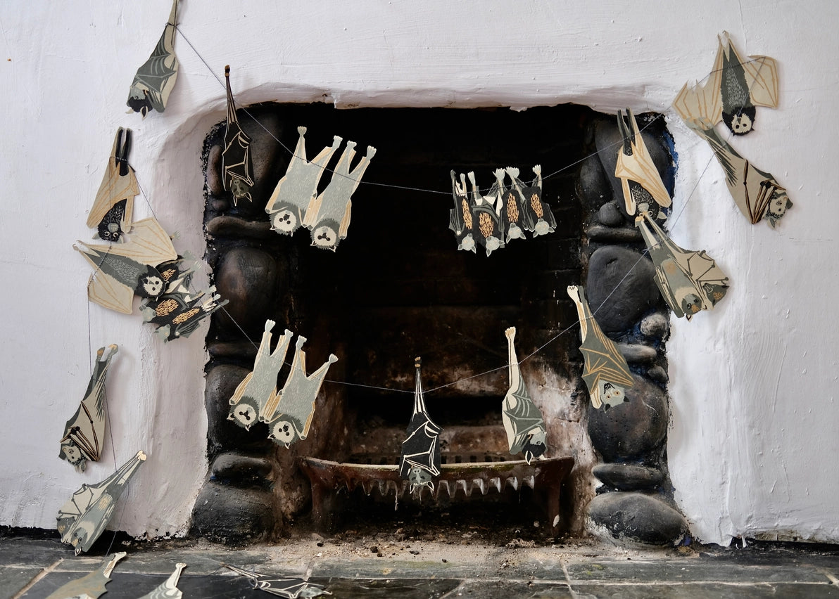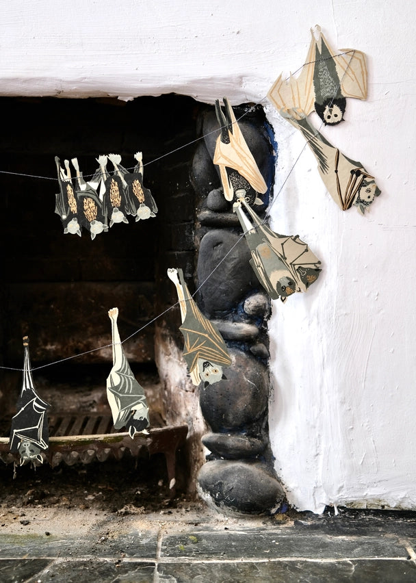 Hand-printed 10ft paper garland featuring ten screen-printed paper spooky Halloween bats. The garland is printed on both sides on thick, handmade cotton paper. The shapes are sewn in a random order along strong cotton thread, with hanging loops on either end, meaning the garland can be hung straight away!