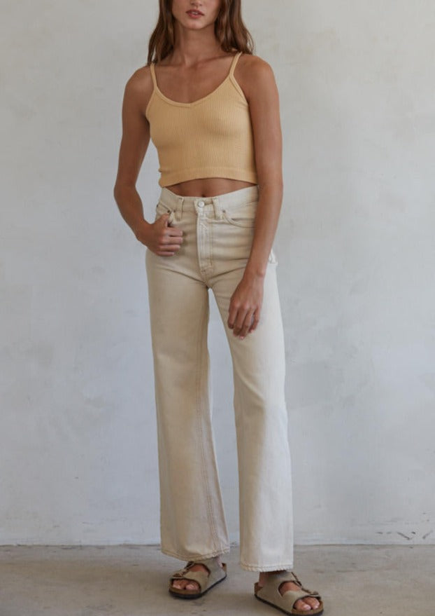 Essential basic cami in a super stretchy and soft ribbed material, featuring a v-neckline and a formfitting silhouette.
