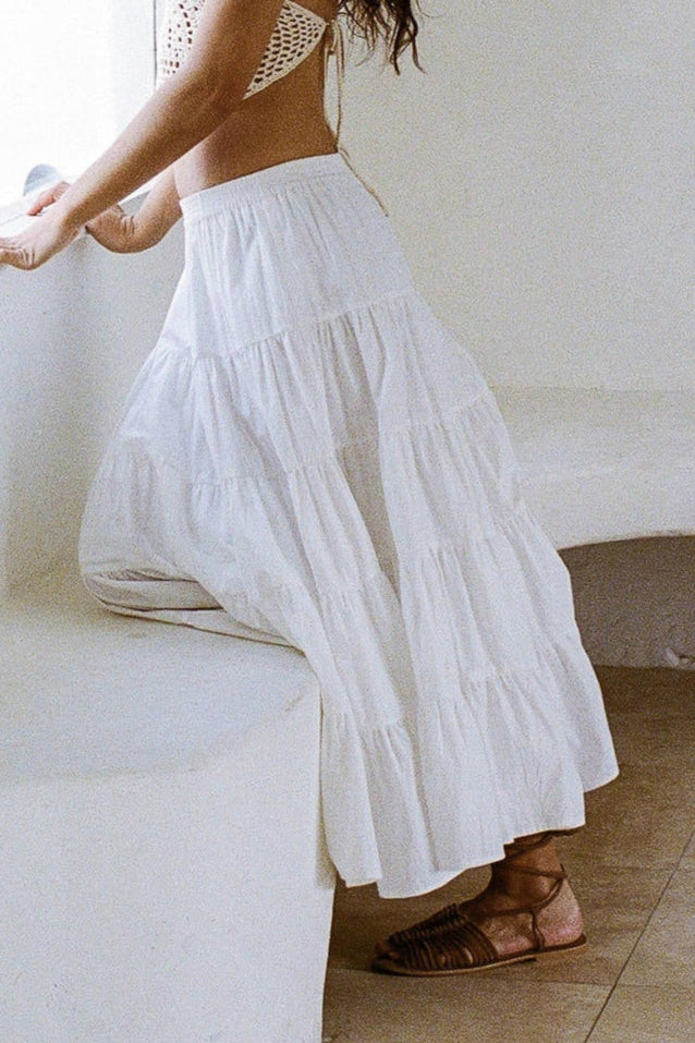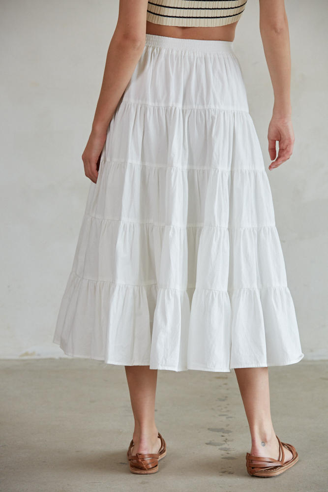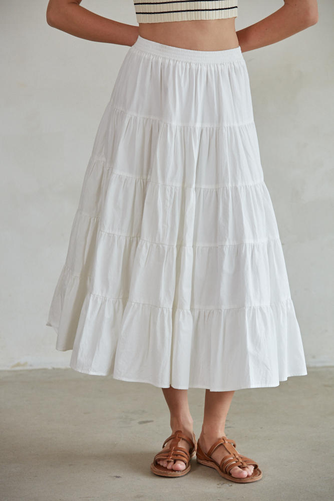 So effortless and chic, this midi skirt is featured in a soft cotton fabrication and mid-rise fit with a tiered silhouette and elastic waistband.