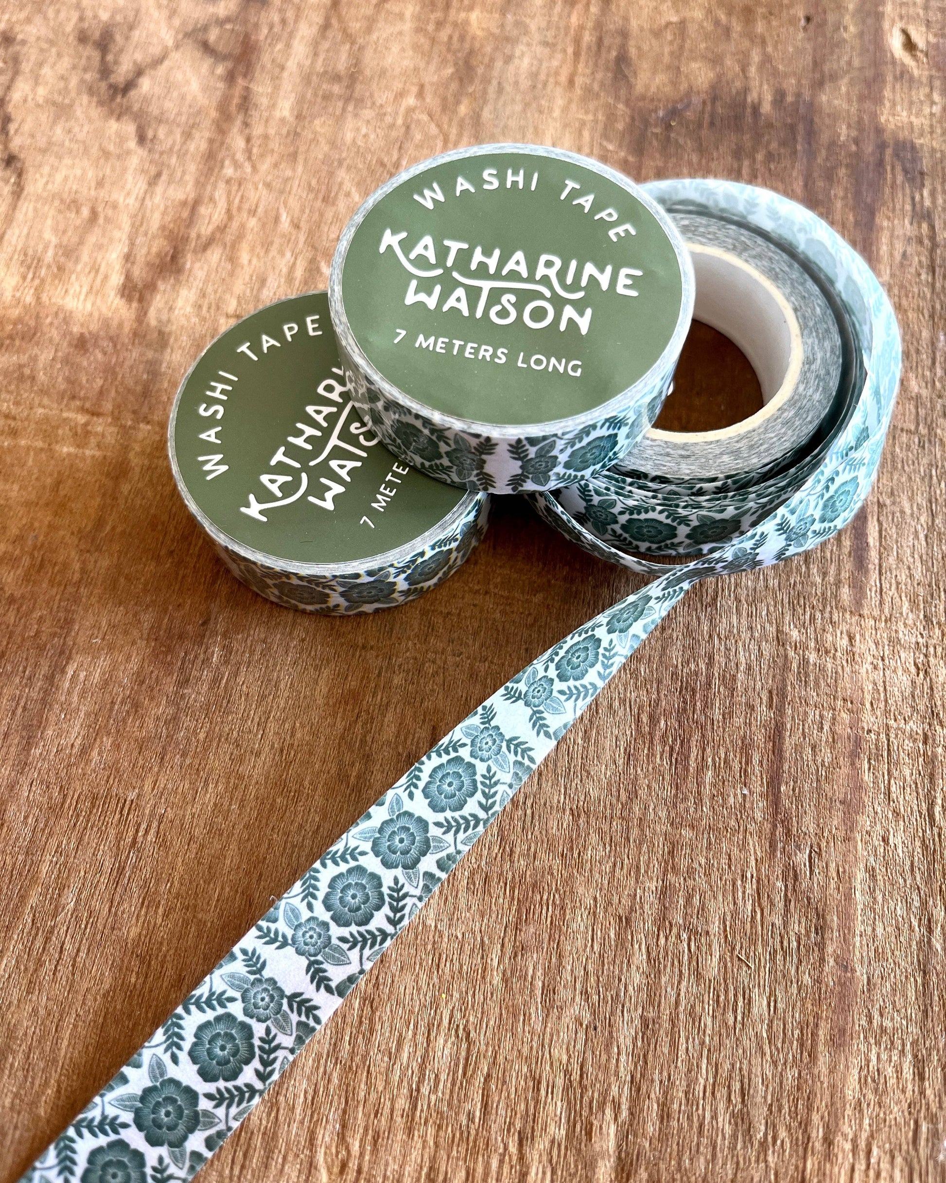 Each roll of tape is 7 meters long and features a reproduction of one of Katharine's original block print designs.