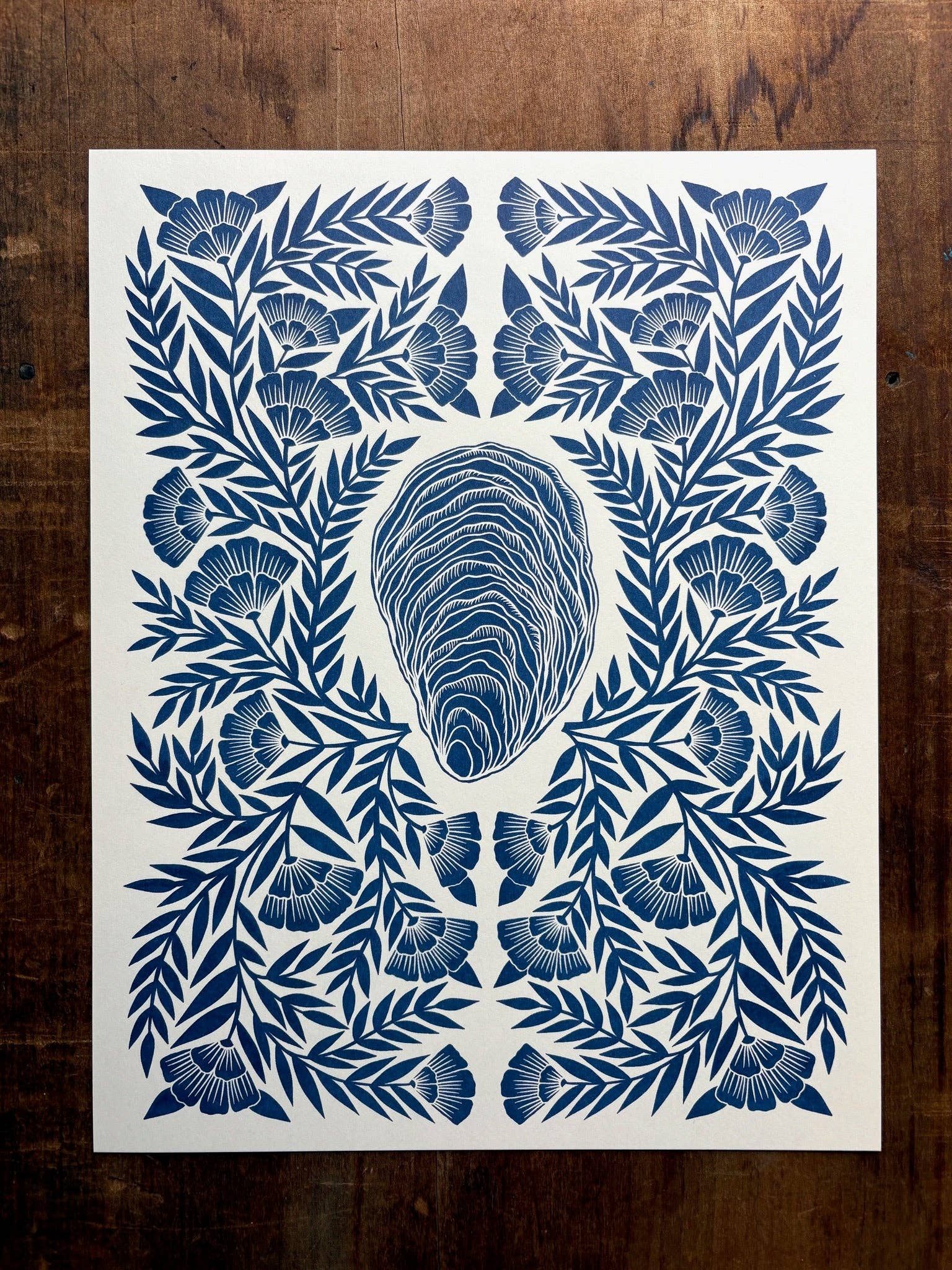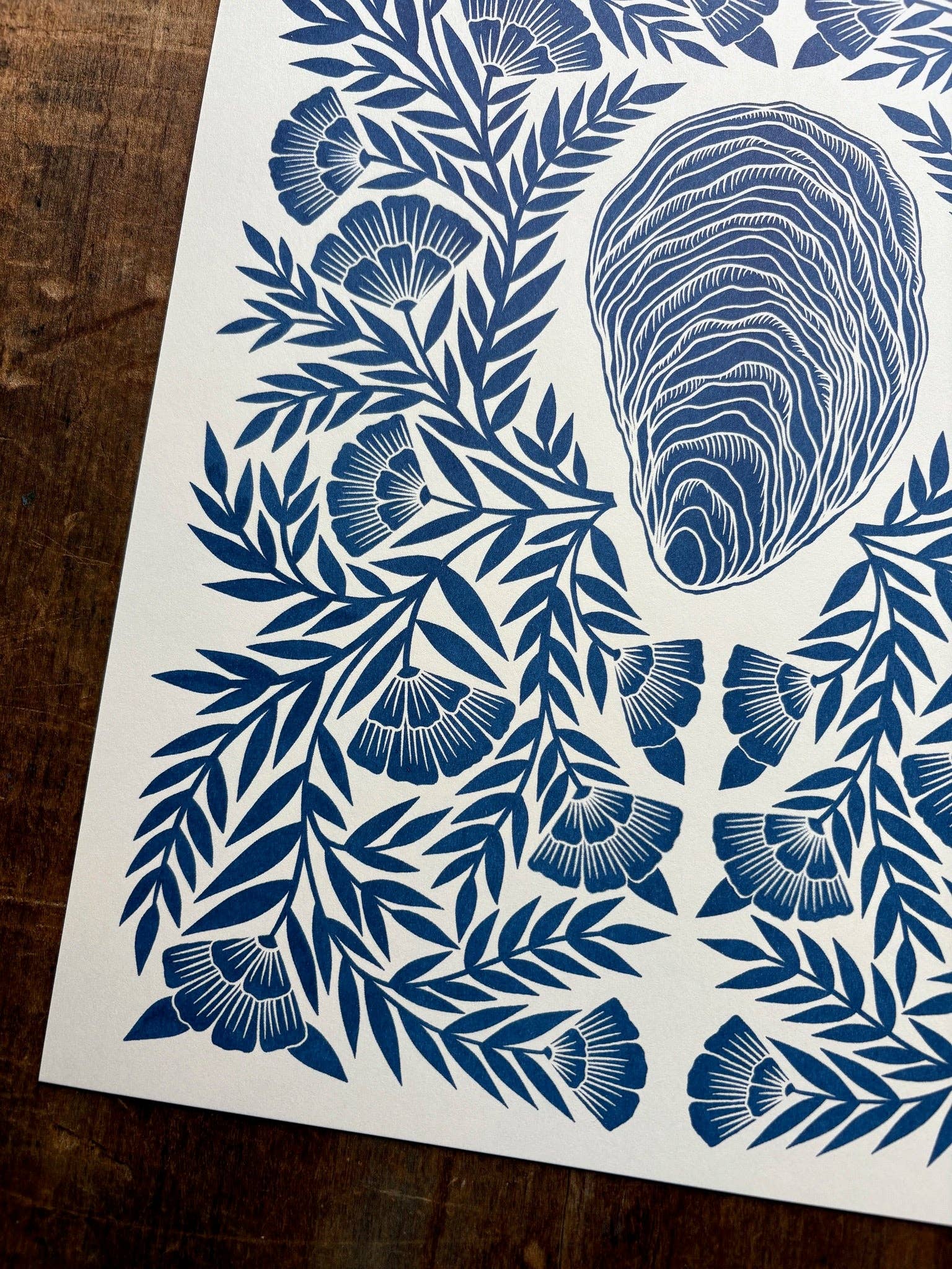 An original Katharine Watson oyster print, risograph printed in deep blue. This is a risograph print, which is a process similar to screen printing. It is based on an original linocut print by Katharine Watson.