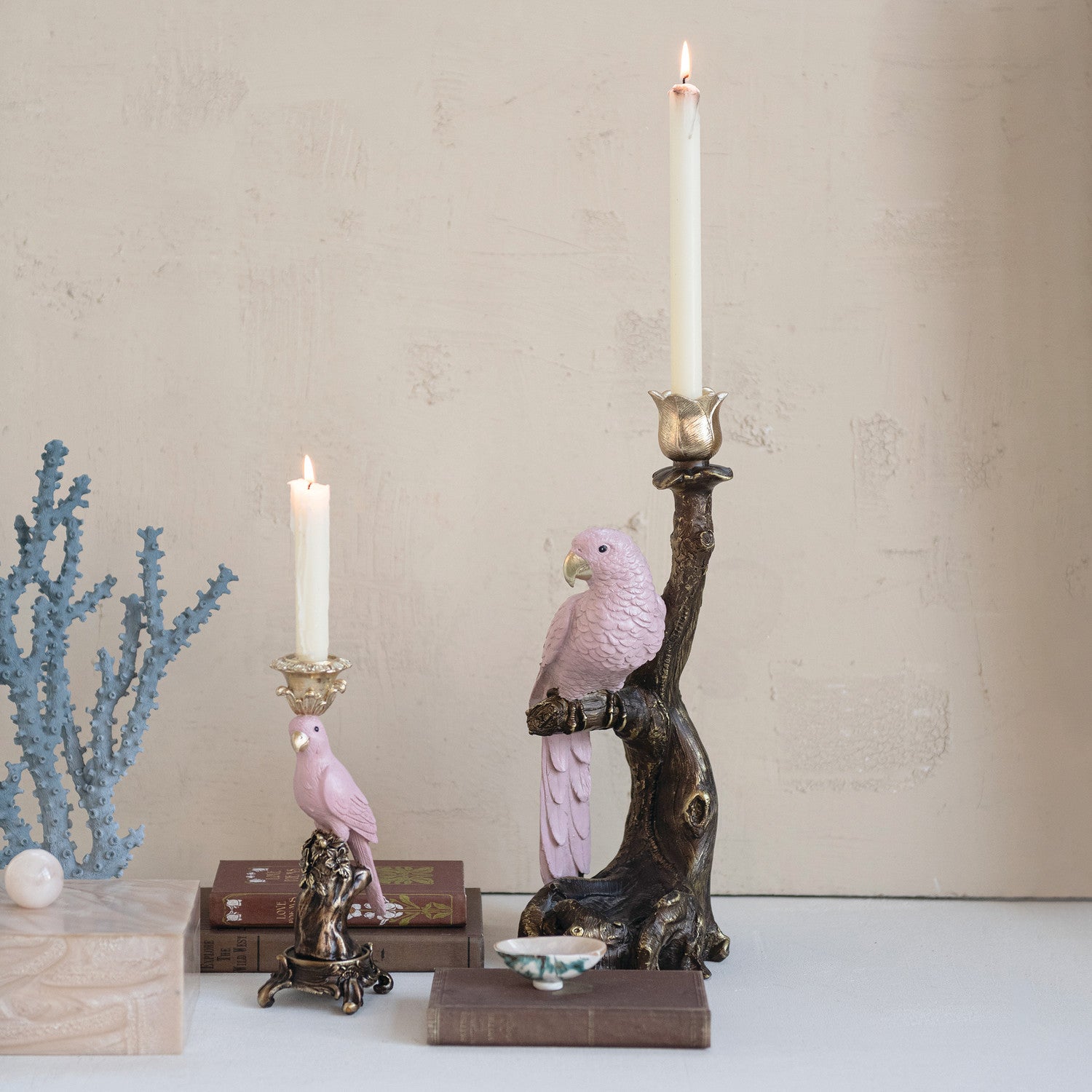 Charming resin taper holder featuring a colorful parrot perched on a branch. Finished in antique gold with pink accents.