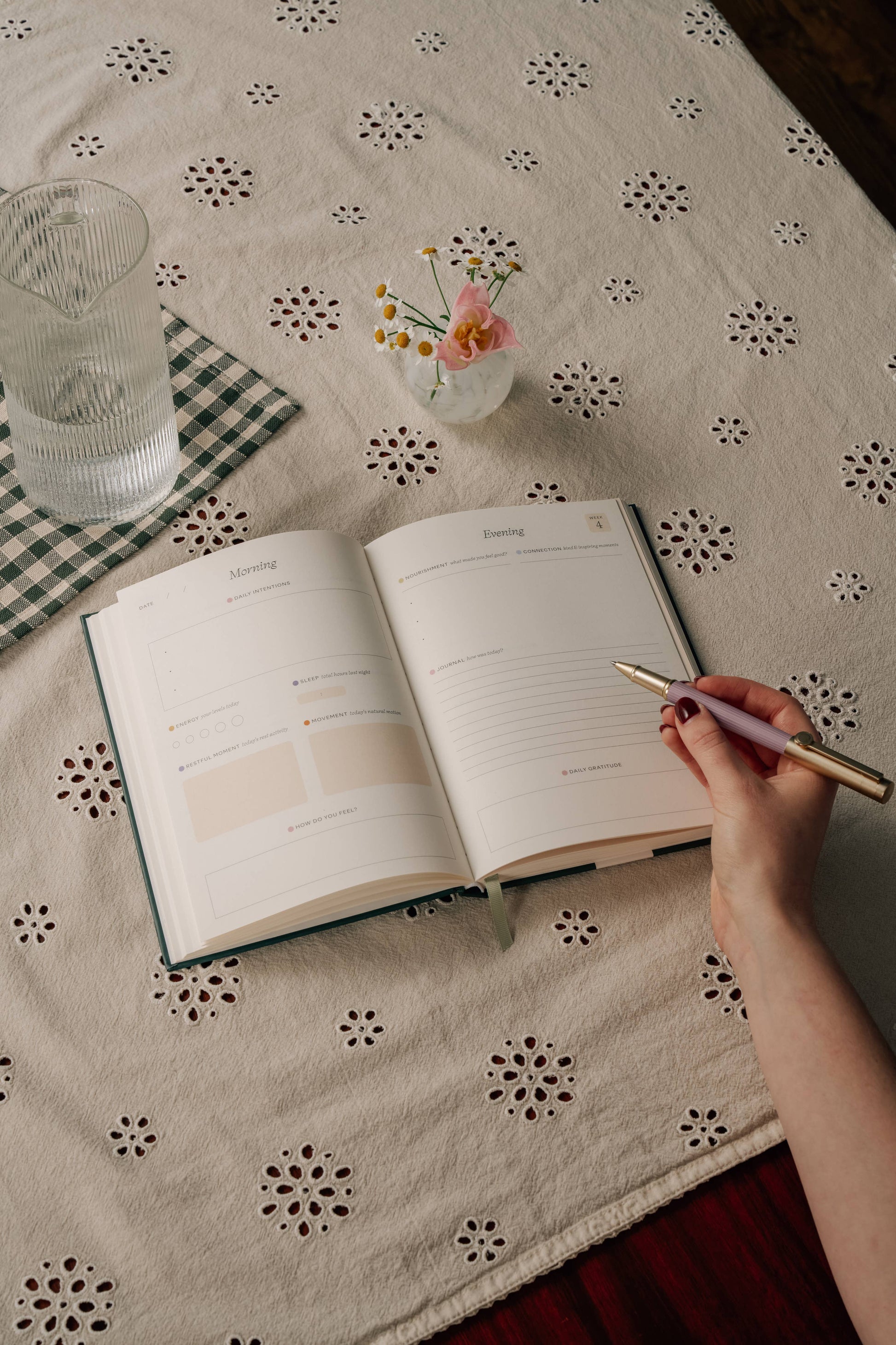 - 12 weeks worth of daily overview pages (two-page spread for each day), with space for logging intentions, sleep and energy levels in the morning and evening