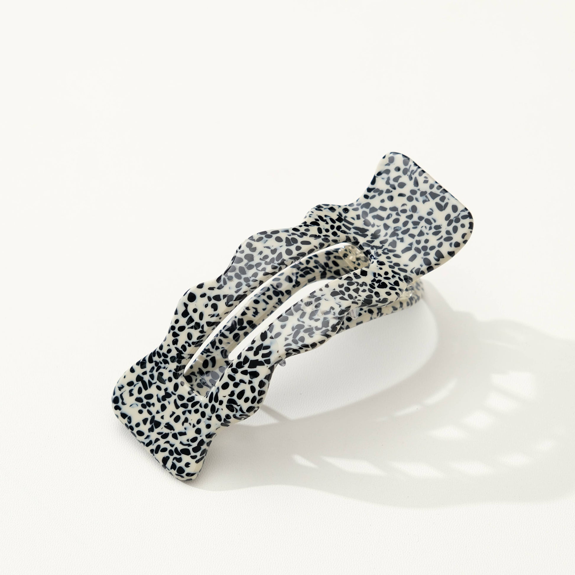 Featuring a scalloped rectangle shape, this 4.5 inch claw clip is a flat design that will hold short/med hair and is great for half-ups.