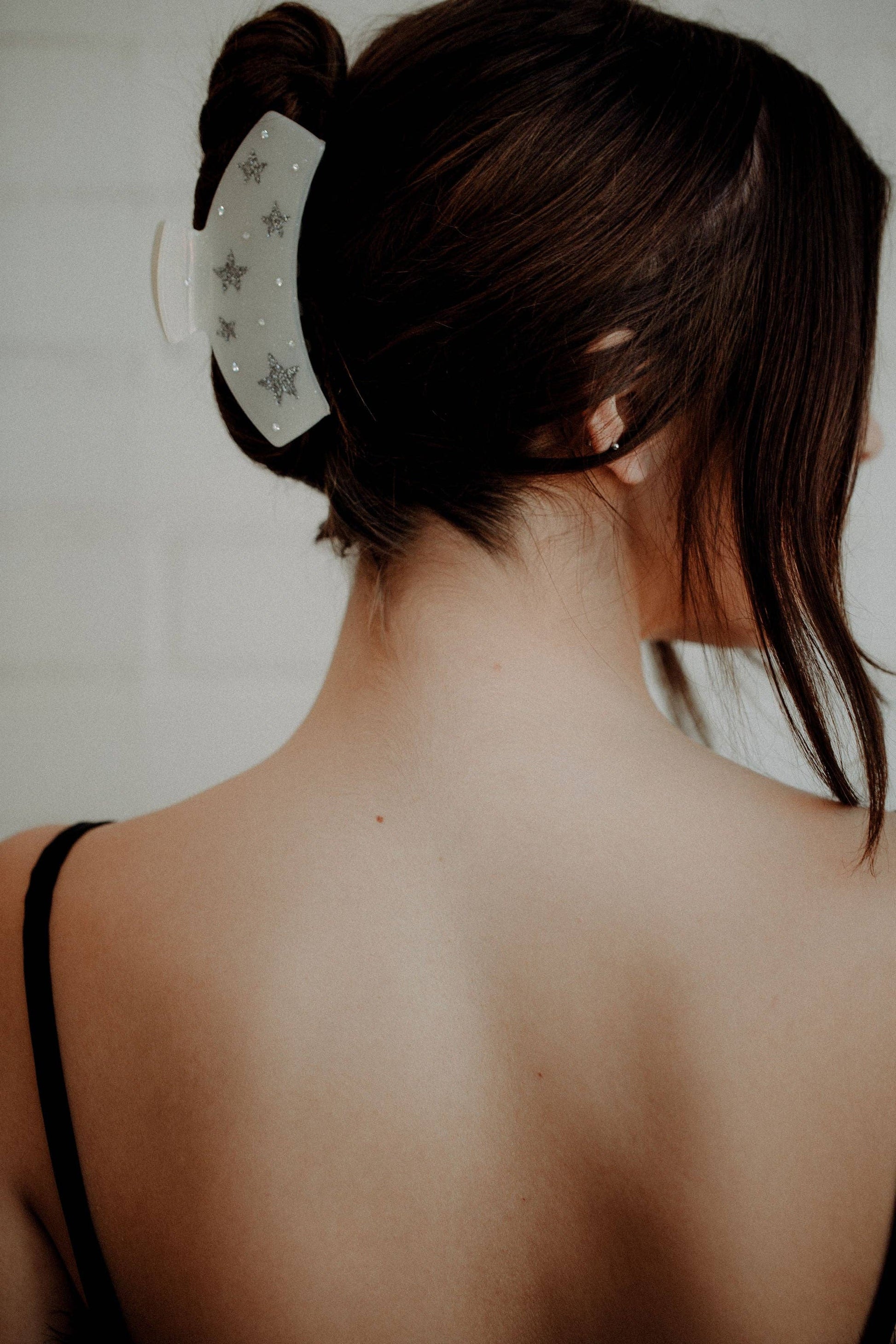 Get ready to shine. The Shimmer Claw features hand spliced glitter stars on shimmery backgrounds in three party-ready colors: white, black, and iridescent pink. A comfy, curvy body makes this claw perfect for all hair types.