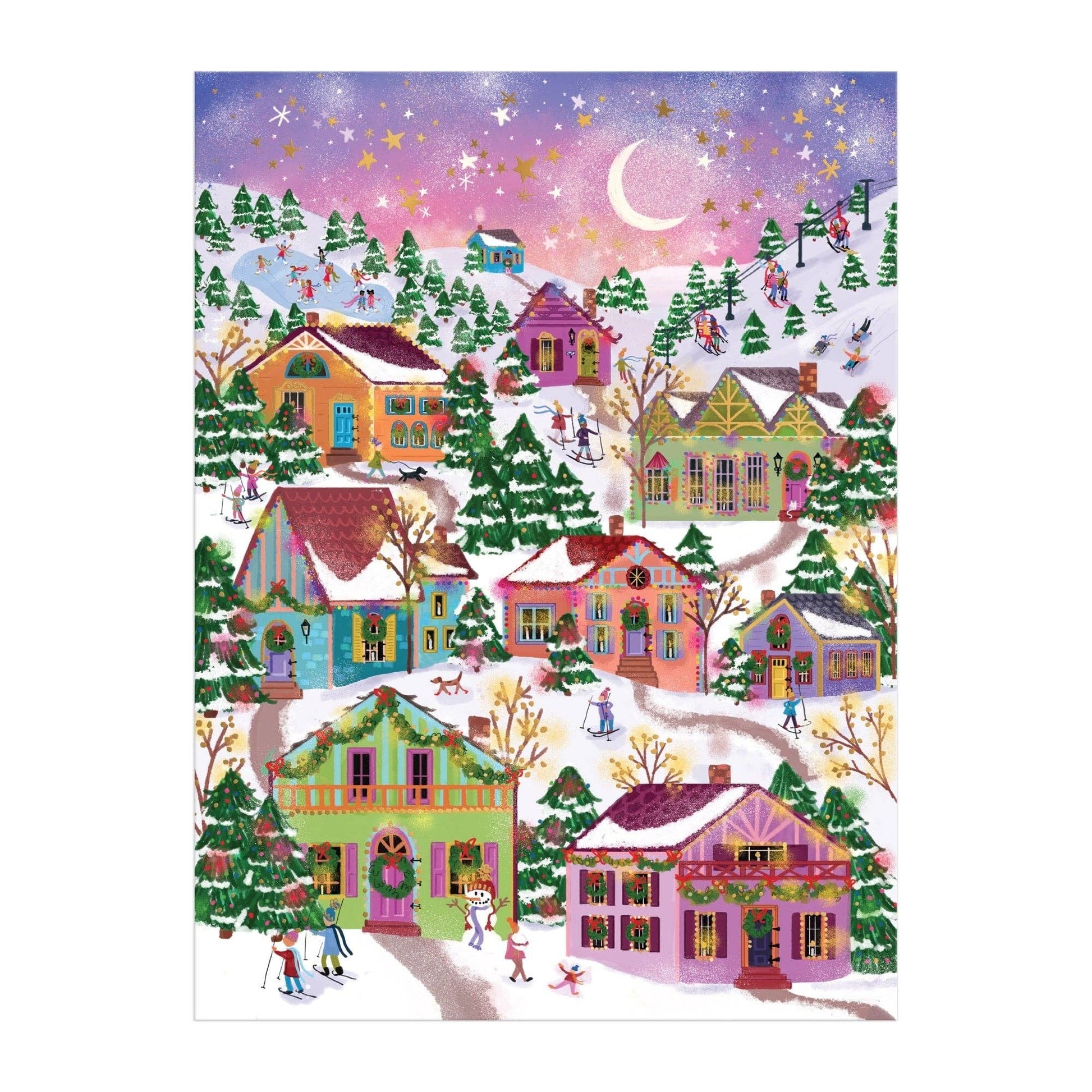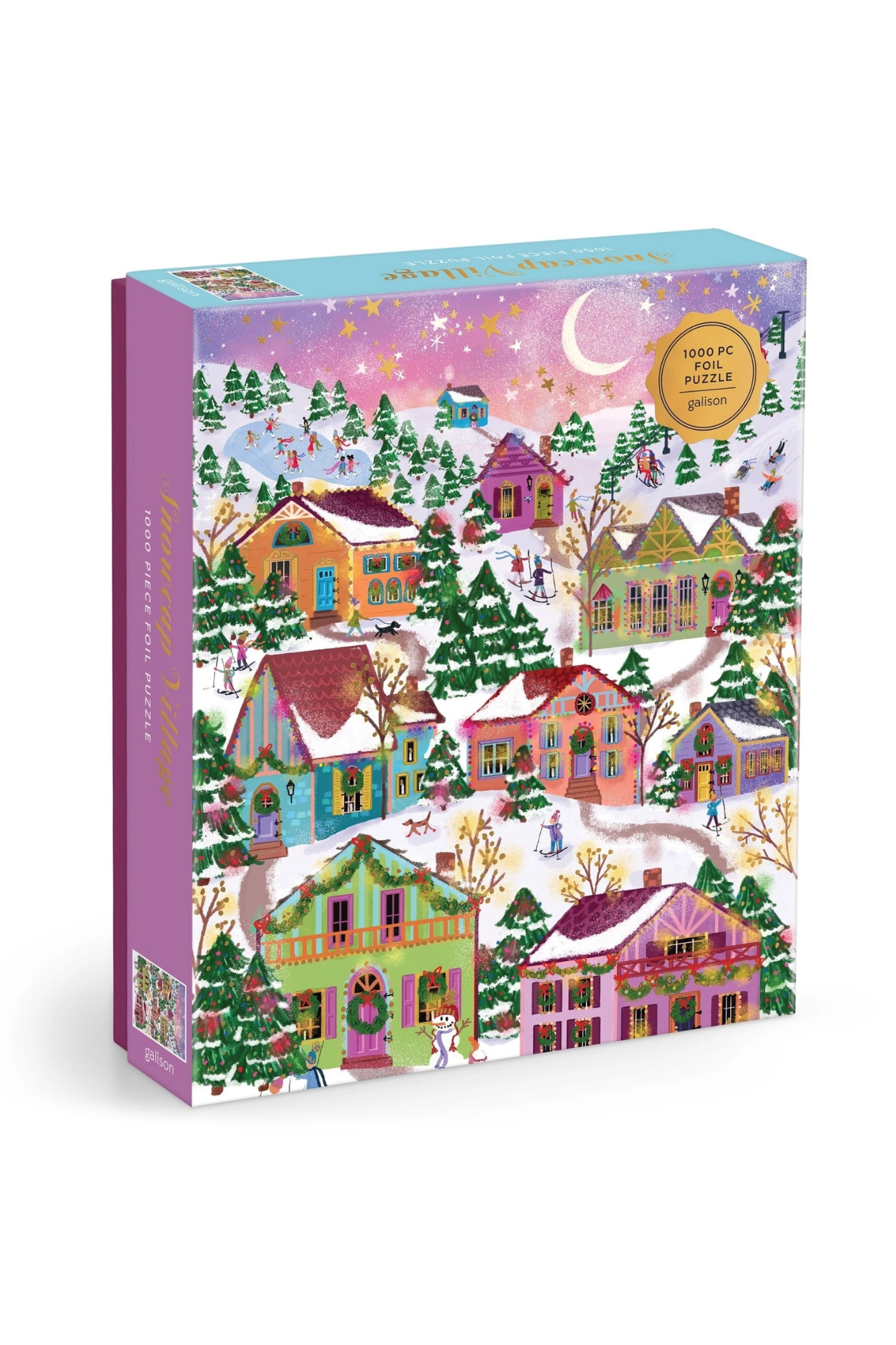 This premium 1000-piece puzzle features Joy Laforme's intricate "Snowcap Village" illustration enhanced with sophisticated foil printing technology. The specialized foil elements create dynamic light-reflective properties that transform the puzzle experience, adding dimensional complexity to the winter scene. Each precision-cut piece contributes to a challenging assembly process, with the foil details serving as both visual guides and obstacles that test advanced puzzling techniques.