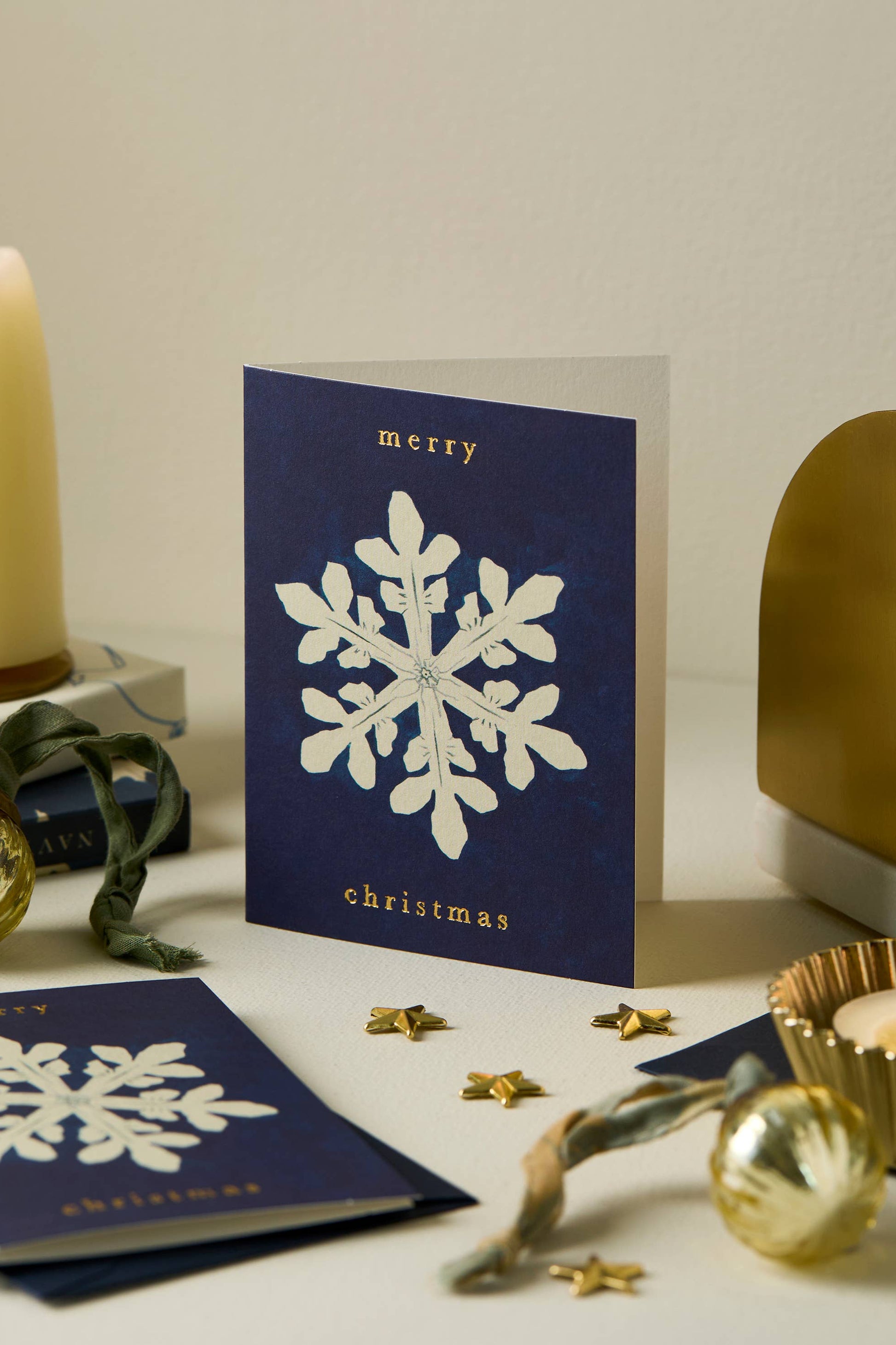A little snowflake card that is beautiful in its simplicity; a deep indigo background and envelope, a delicate snowflake design and gold foil text. Each one is paired with a deep blue C7 envelope Designed and printed in the UK on FSC certified papers.