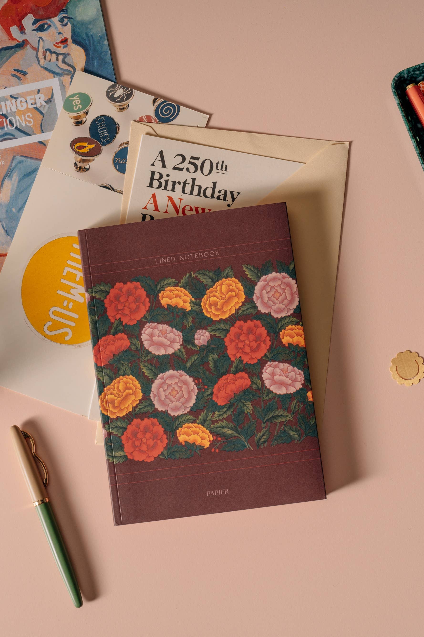 The softcover design has a fold out flap that you can use as storage to tuck away important papers, or tuck it in to keep your place. Featuring a timeless classic, dark and moody floral print, this notebook is bound to brighten any desk.