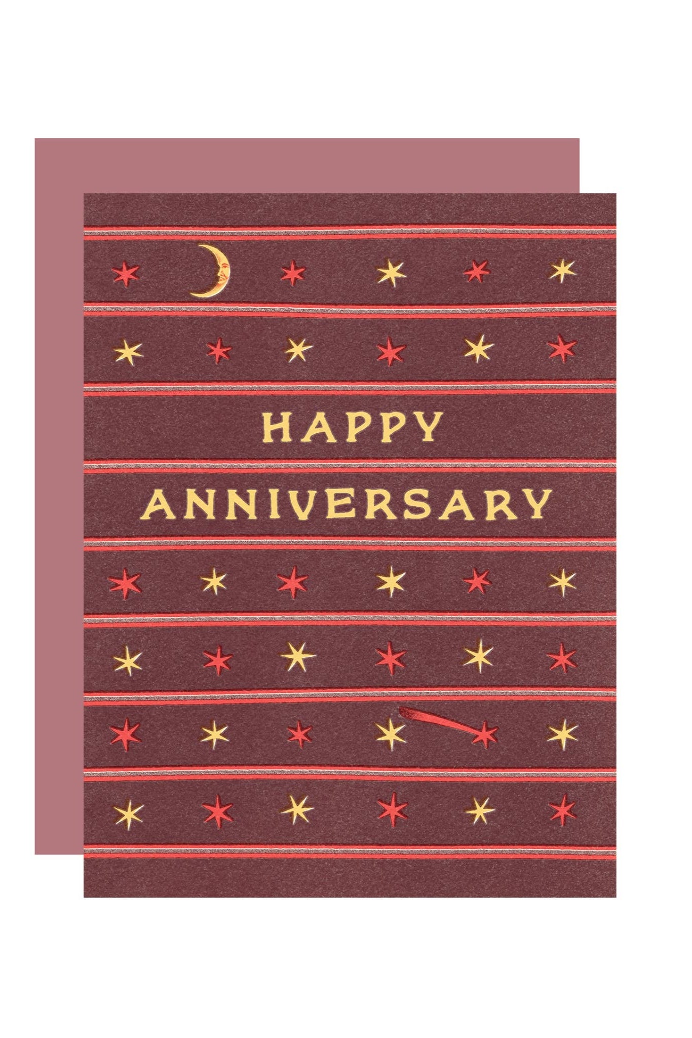 Painterly pinprick stars decorate the cover of this warm anniversary card, swathed in a cozy burgundy background.