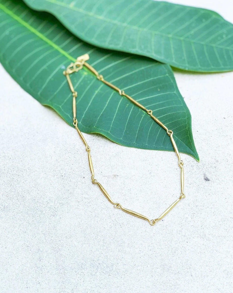 A new twist on the link. Solid tapered brass pieces form links to make a complete chain. Adds to a layered look.It has a nice weight that is comforting when worn.