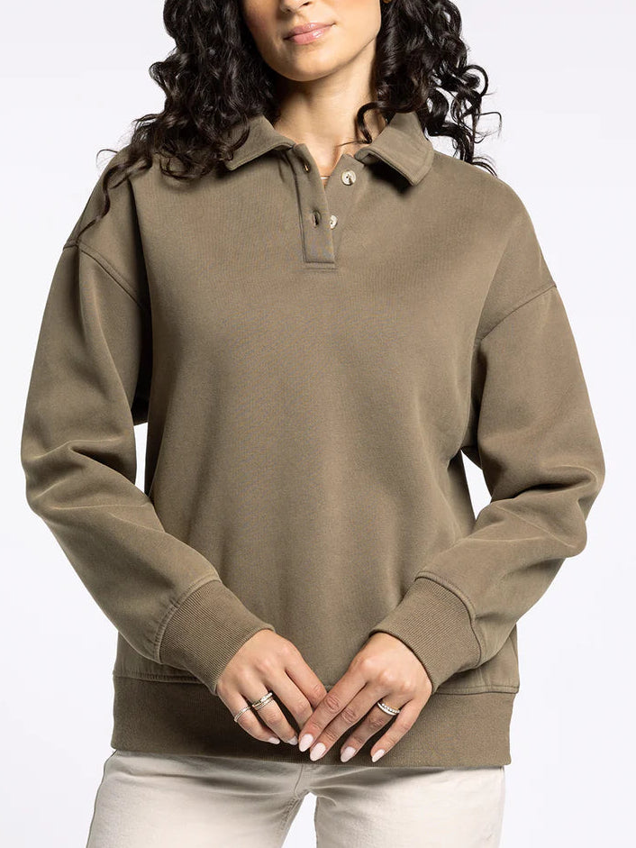 A cozy classic, this sweatshirt is featured in a soft garment dyed fabrication with a half button neckline and oversized fit.