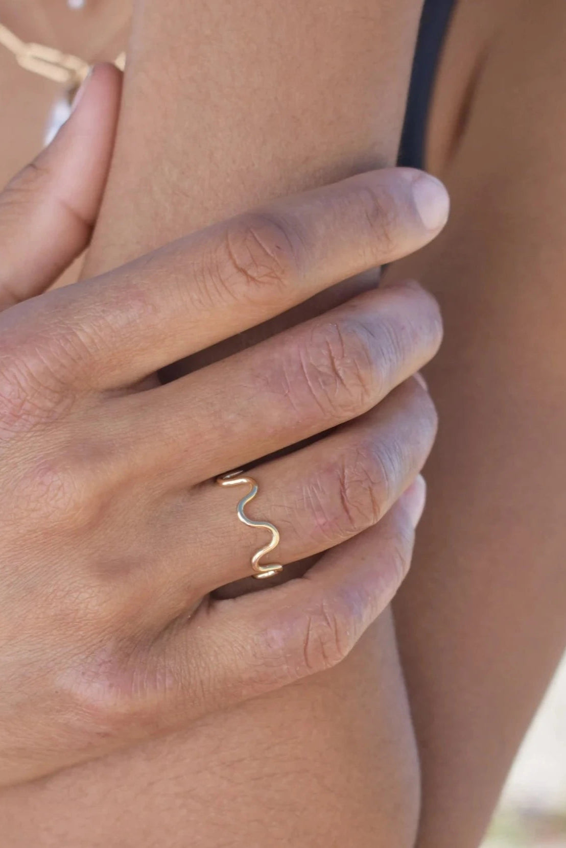 Whimsical, loosely curvy ring sculpted from 14k gold fill.