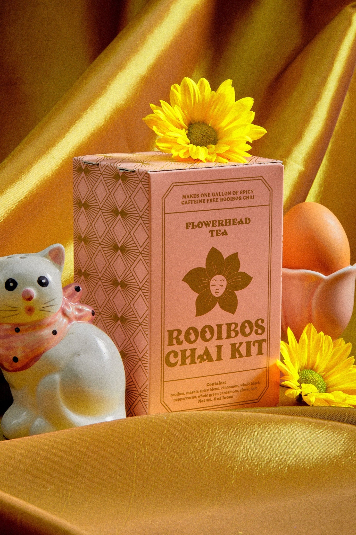 Includes: Good vibes, easy instructions, rooibos, masala spice blend, cinnamon, whole black peppercorn, whole green cardamom, clove, and salt.