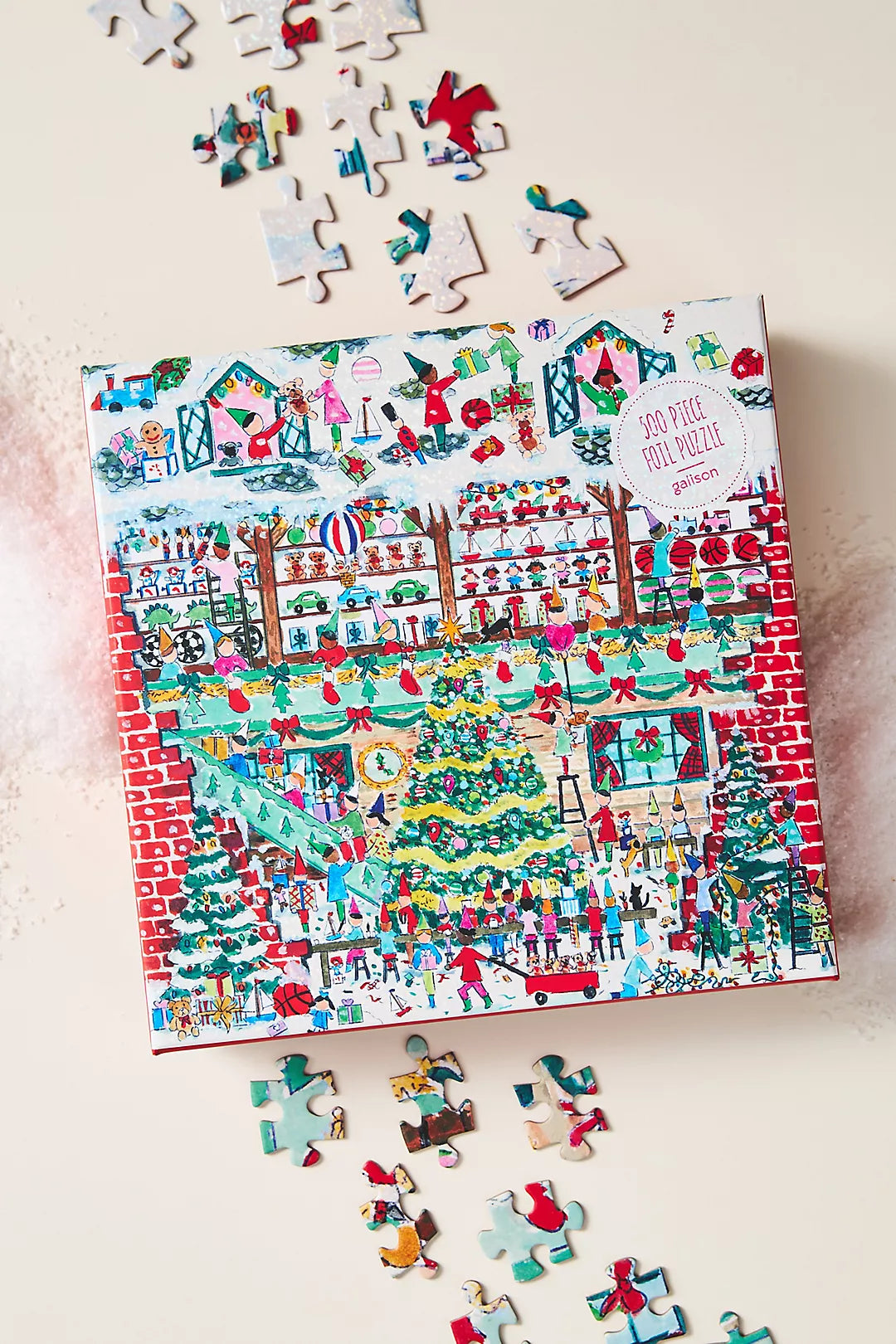 Michael Storrings Toy Workshop 500 Piece Puzzle by Galison features the spirit of a toy workshop, embellished with frosty foil accents.