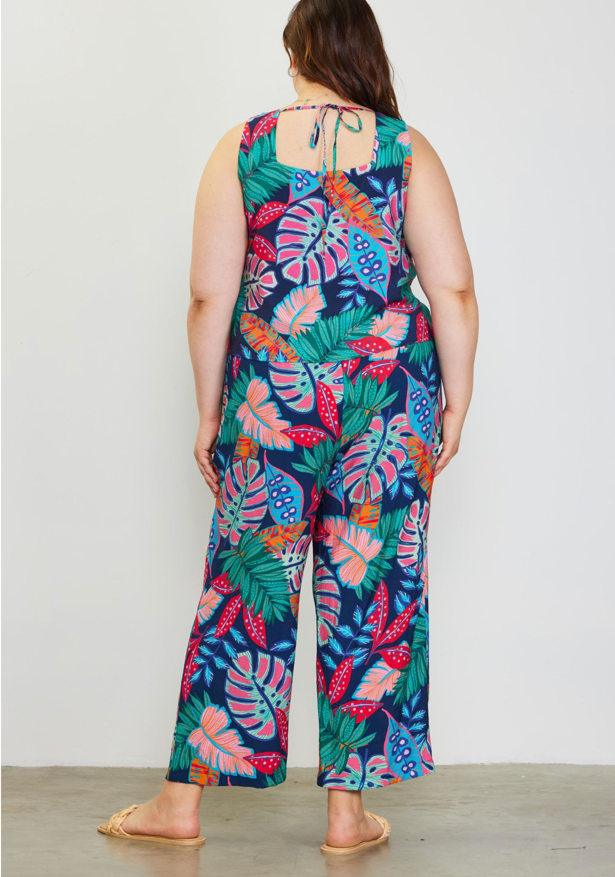 When you're in the mood for having fun with your look, turn to these bright tropical printed pants! Gleaming in neon colors and frond shapes, the pull on style sits comfortably high on the waist before flowing to an ankle-length kicky wide-leg shape.