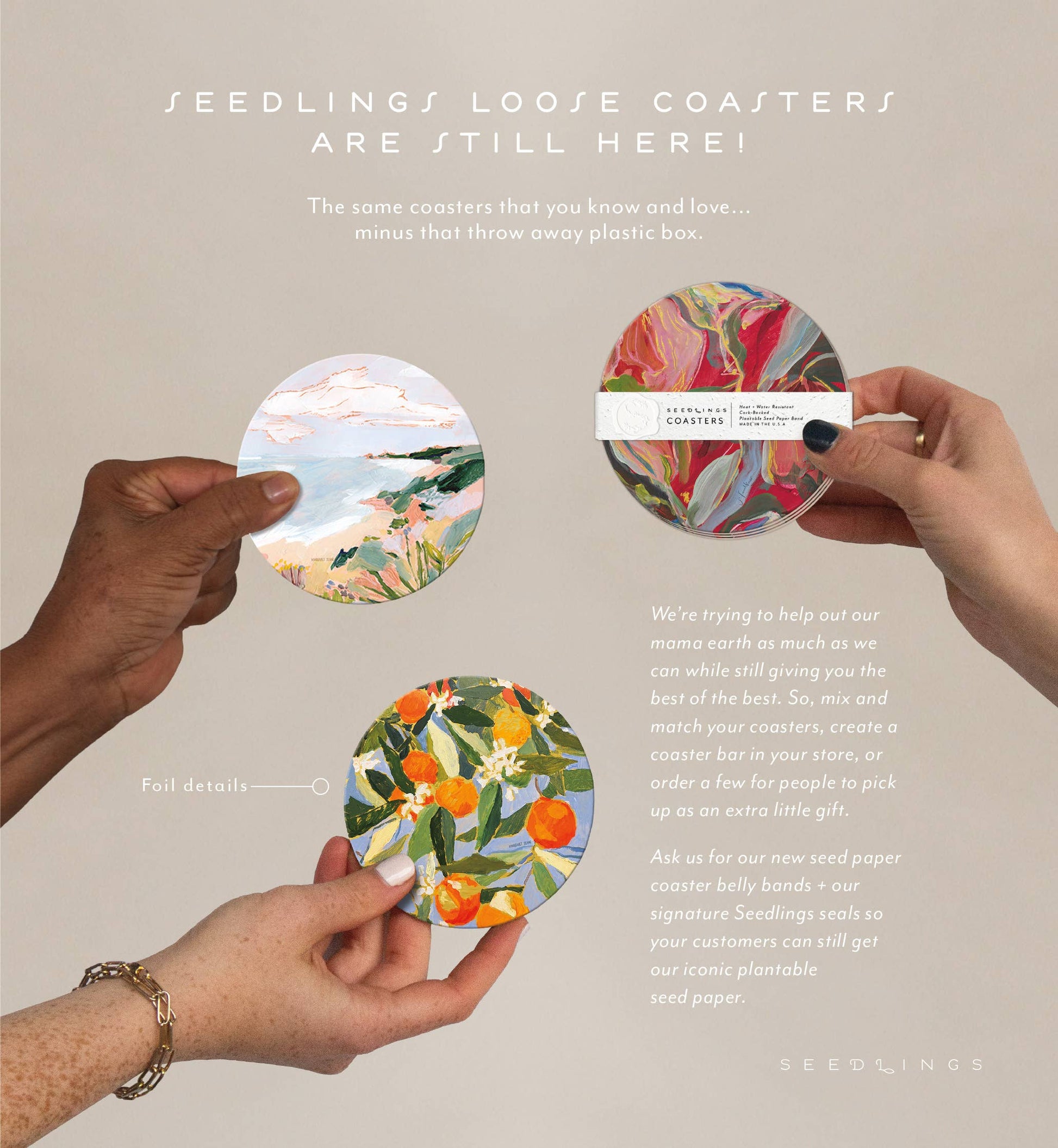 These loose coasters feature hot foil stamped designs, which are corked-backed and heat + water resistant.