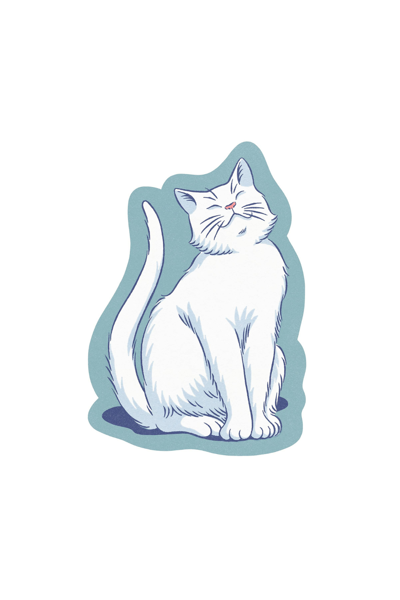 This white cat proudly flaunts her well groomed coat and soft whiskers, hoping you’ll give her a home on your favorite water bottle or sticker-friendly surface.