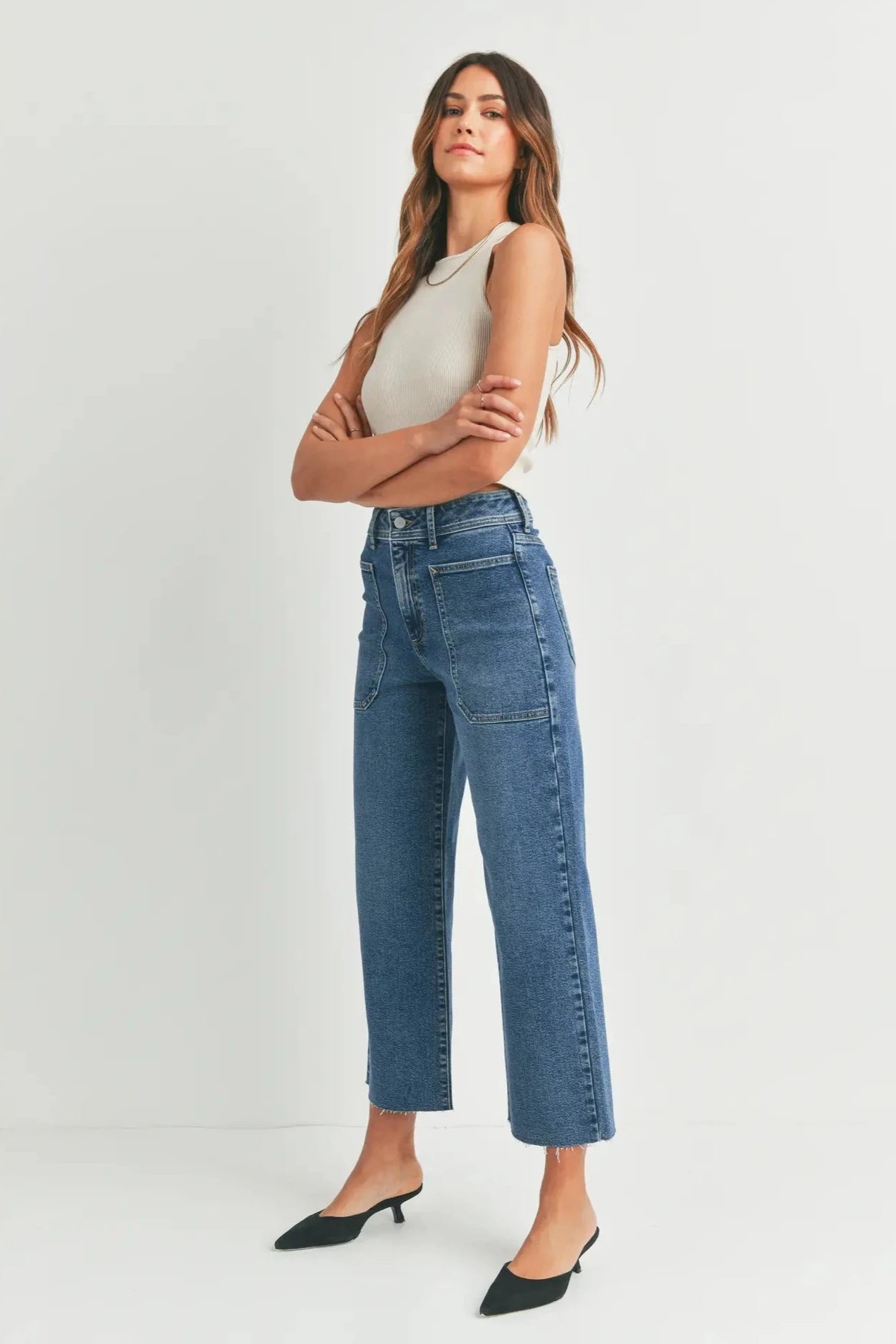 We're *obsessed* with the style of these jeans! The perfect utility-inspired pair with a contemporary twist, these pants are a true staple from season to season. Super high rise with a slight stretch, exaggerated front pockets and raw hemline.