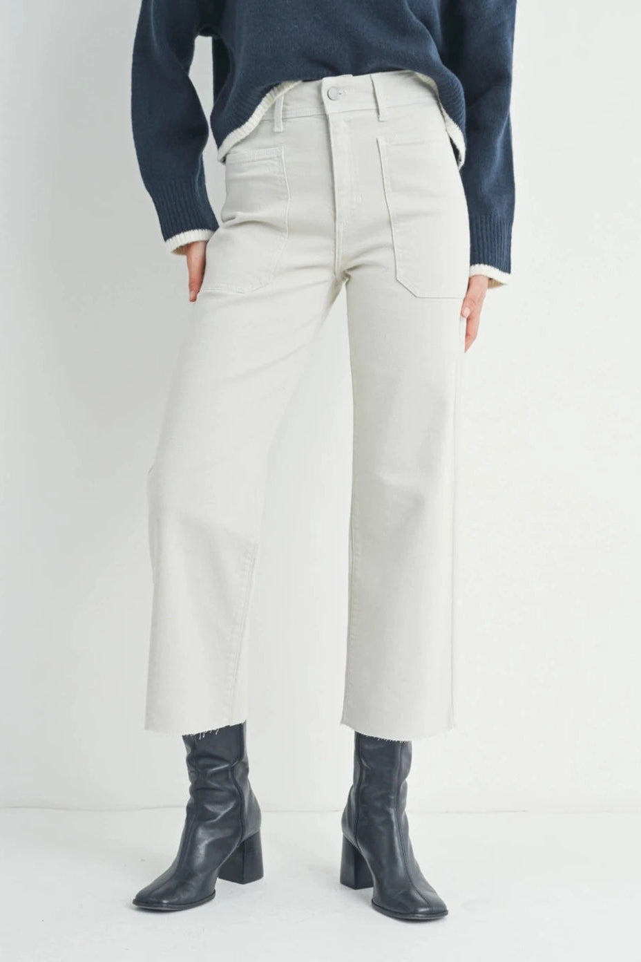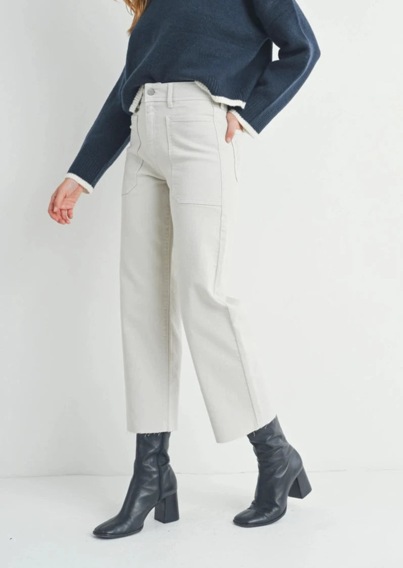 We're *obsessed* with the style of these jeans! The perfect utility-inspired pair with a contemporary twist, these pants are a true staple from season to season. Super high rise with a slight stretch, exaggerated front pockets and raw hemline.